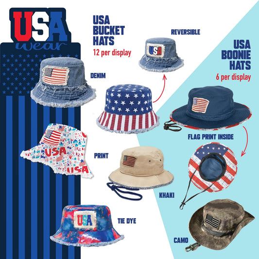 Usa Bucket and Boonie Patriotic Hat Assortment CLIP STRIP - 18 Pieces Per Pack 88536