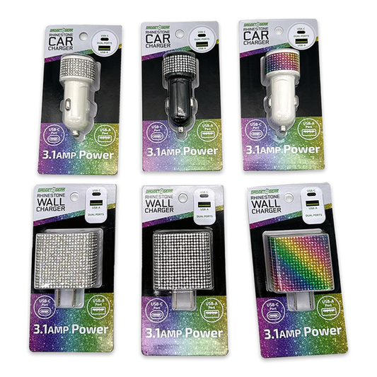Car Charger and Wall Charger Dual Port USB / USB-C Rhinestone Assortment - 6 Pieces Per Retail Ready Display 88502